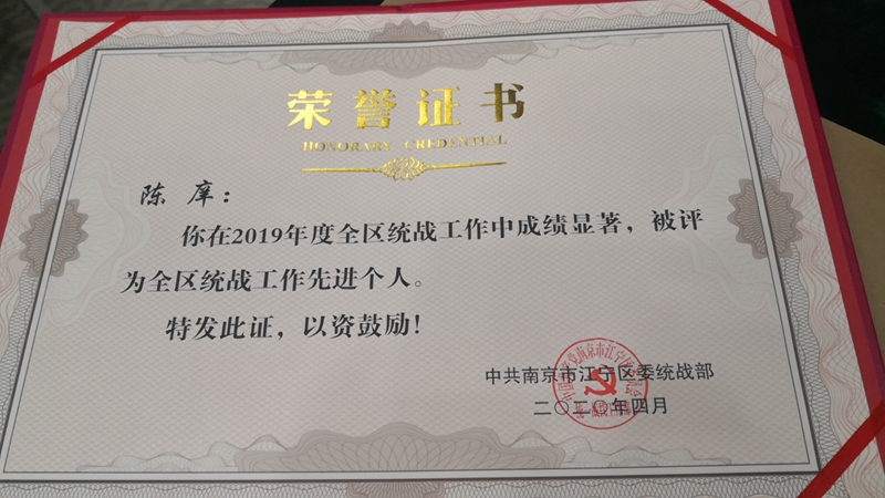 本党党员陈庠被中共江宁区委统战部表彰。