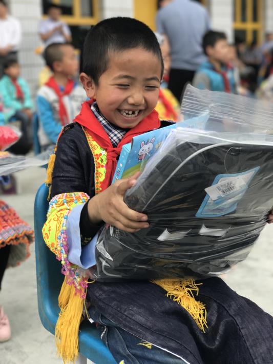 手捧新书包,孩子们露出了灿烂的笑容