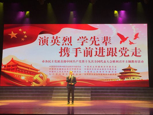 本党党员、三胞集团副总裁花贵侃作为党派成员代表发言。他说,话剧中英雄们的感人故事,现实生活里中国共产党带领人民夺取革命胜利、创造幸福生活的动人事迹,都在时刻提醒我们,跟中国共产党走的信念不能移,走中国特色社会主义道路的脚步不能停,在新的时代,必须撸起袖子加油干。作为致公党员,他从加入党派后,市委会胡主委对待党派工作的率先垂范、对待党员的关心爱护;从党员们之间亲如一家、积极参与各项党务工作时的奉献付出;从中共各级党委对党派工作的支持帮助等方面与参会代表们分享了他对致公党这个集体、对统一战线、多党合作的真情实感。