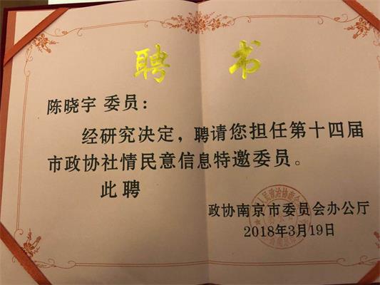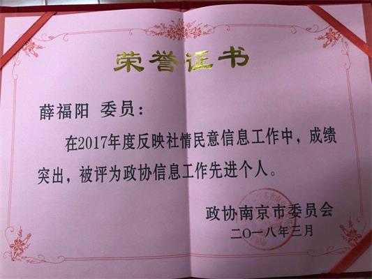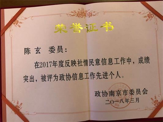 3月19日,南京市政协召开全市信息工作会议,会上,南京市政协研究室主任吴国璋宣读了南京市政协《关于表彰2017年度政协信息工作先进集体、先进个人和先进工作者的决定》,市委会副主委陈玄和妇女工作委员会主任薛福阳作为2017年度政协信息工作先进个人被表彰,市政协委员、江宁区党员陈晓宇被聘为市政协社情民意信息特邀委员。