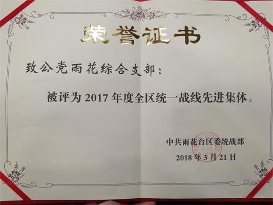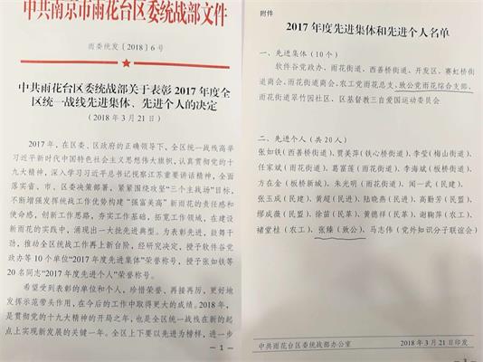 雨花台区综合支部获区统一战线先进集体表彰