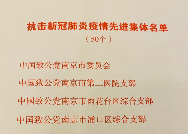 致公党南京市委会、南京市第二医院支部、南京市雨花台区综合支部、南京市浦口区综合支部被表彰为抗击新冠肺炎疫情先进集体。